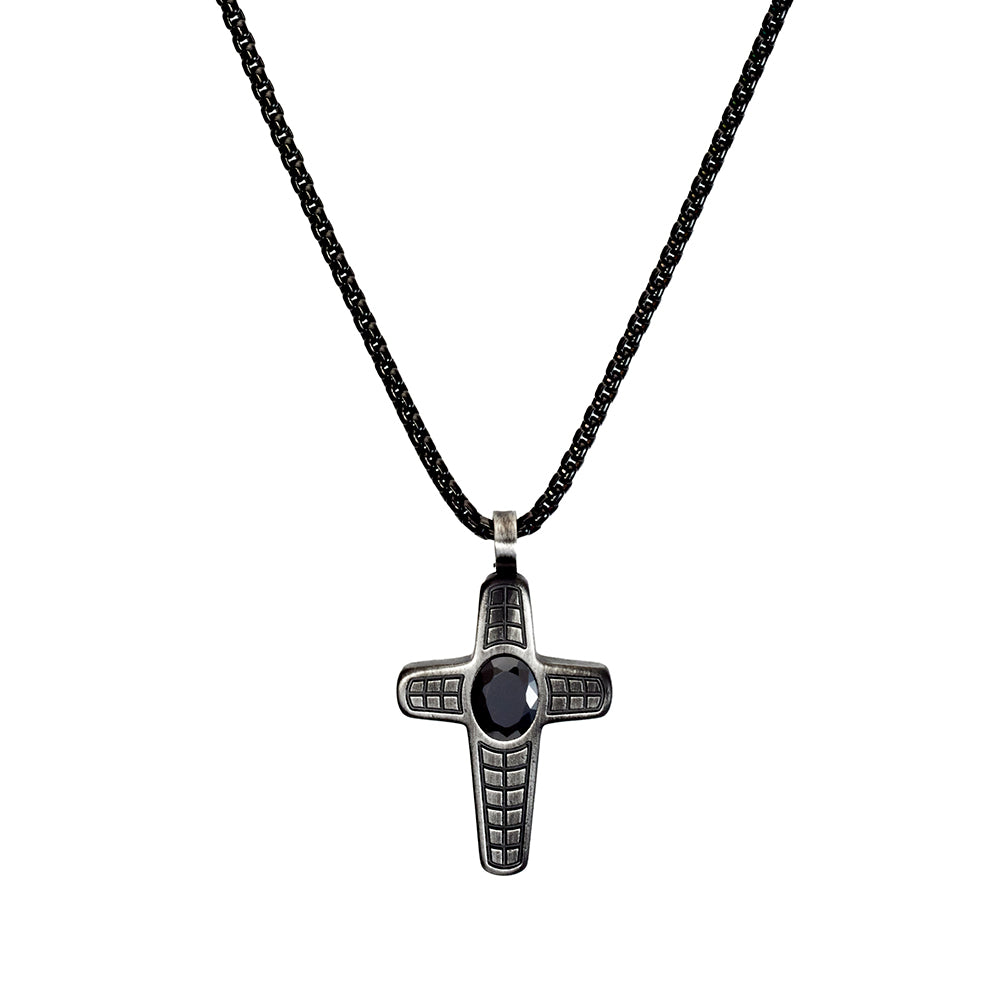 Blaze men’s black stainless steel round edge patterned cross pendant necklace