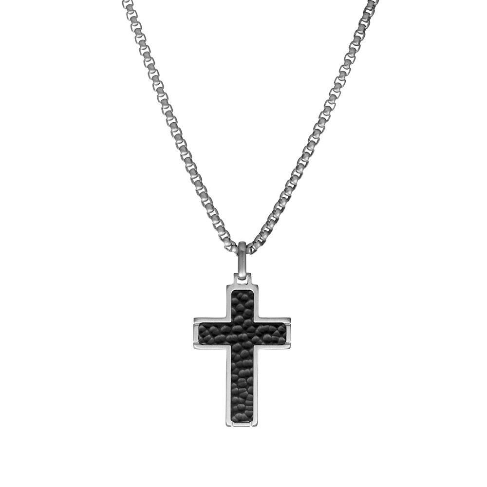 Blaze men’s matte stainless steel necklace with hammered IP black cross pendant